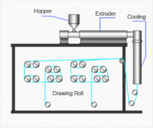 單絲 通過(guò)擠出機(jī)將高分子樹(shù)脂擠出細(xì)絲(如同從面條機(jī)中擠出面條一樣)形狀后進(jìn)行冷卻,再拉伸成細(xì)絲以增強(qiáng)細(xì)絲強(qiáng)度的成型方法。 單...