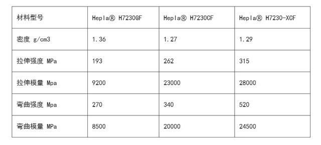 該產品具有優(yōu)異的機械強度與抗沖擊能力,尺寸穩(wěn)定性高、翹曲低,材料性能較進口產品提升30%。以高溫尼龍為基材的Hepla? H9000-XCF系列碳纖維復合材料,彎曲剛度超過52GPa,彎曲強度高達520MPa,拉伸強度達到360MPa;以PA66為基材的Hepla? H7200-XCF系列拉伸強度達到315MPa。 采用新產品生產的零部件比鋼制零部件輕75%,比鋁合金部件輕40%,可替代大部分金屬,從而為汽車輕量化及其它行業(yè)“以塑代鋼”提供更好的解決方案。