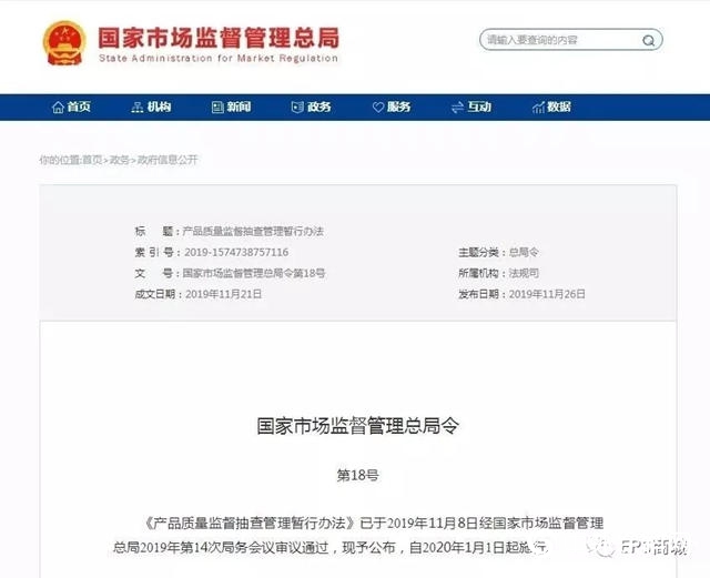 ????????11月26日,國家市場(chǎng)監(jiān)督管理總局發(fā)布《產(chǎn)品質(zhì)量監(jiān)督抽查管理暫行辦法》,將自2020年1月1日起施行。《辦法》共56條,明確了監(jiān)督抽查的組織、抽樣、檢驗(yàn)、異議處理、結(jié)果處理及相關(guān)人員應(yīng)承擔(dān)的法律責(zé)任,對(duì)于加強(qiáng)產(chǎn)品質(zhì)量監(jiān)督管理、規(guī)范產(chǎn)品質(zhì)量監(jiān)督抽查工作、保護(hù)消費(fèi)者的合法權(quán)益有重要意義。