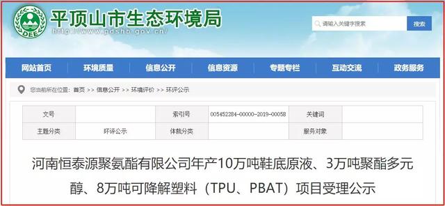 ????????2019年12月13日,平頂山市生態(tài)環(huán)境局發(fā)布河南恒泰源聚氨酯有限公司年產(chǎn)10萬噸鞋底原液、3萬噸聚酯多元醇、8萬噸可降解塑料(TPU、PBAT)項目受理公示。