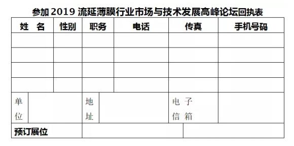 ????????1、請將上述回執(zhí)表于2019年12月20日前發(fā)郵件到ppack@126.com或發(fā)微信到13693270591(流延薄膜)。