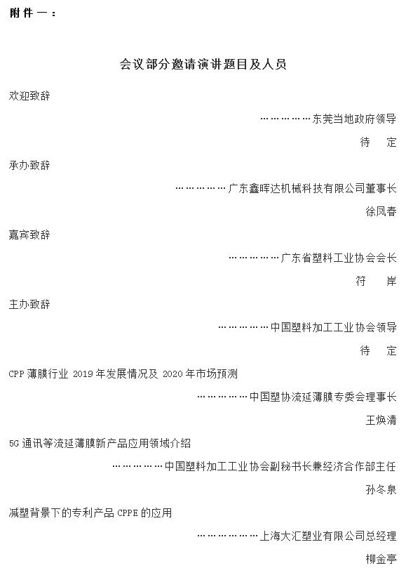 ????????為了交流行業(yè)信息,推廣新技術(shù)、新設備、新材料,鼓勵技術(shù)創(chuàng)新,促進行業(yè)發(fā)展,中國塑協(xié)流延薄膜專業(yè)委員會(簡稱流延薄膜專委會)將于2019年12月26日-27日在廣東東莞召開“2019流延薄膜行業(yè)市場與技術(shù)發(fā)展高峰論壇暨流延薄膜專委會換屆大會、流延聚乙烯纏繞膜、牧草膜行業(yè)誠信與創(chuàng)新發(fā)展聯(lián)盟成立大會暨《流延聚乙烯纏繞膜》團體標準第一次工作會議”。