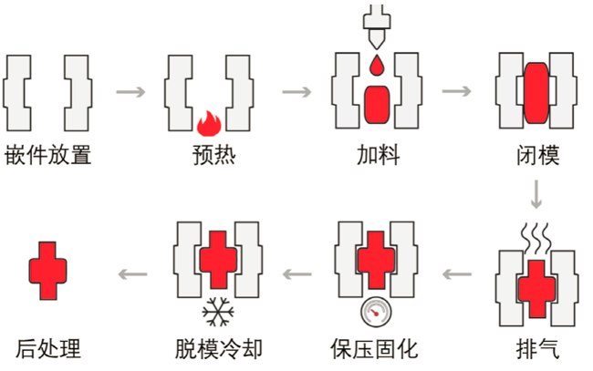 主要用于熱固性塑料制品的生產(chǎn)。成型經(jīng)過加熱使其熔化,加壓沖模,再經(jīng)過加熱交聯(lián)固化,脫模后既得制品。