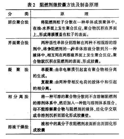 ????????而阻燃劑的微膠囊化也是如此,主要采用的方法包括原位聚合法、界面聚合法、凝聚法、相分離法和溶液干燥法等,表2是具體的制備原理。