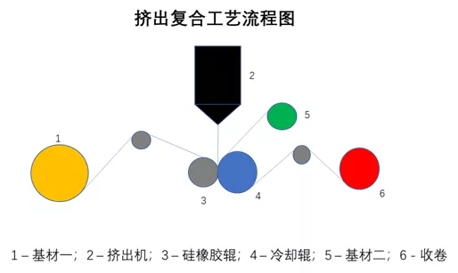 ????????擠出復(fù)合是將聚乙烯等熱塑性材料在擠出機(jī)內(nèi)熔融后擠入扁平??冢蔀槠瑺畋∧ち鞒龊罅⒓磁c另一種或兩種薄膜通過冷卻輥和復(fù)合壓輥復(fù)合在一起。與其他復(fù)合方法相比,擠出復(fù)合具有設(shè)備成本低、投資少、生產(chǎn)環(huán)境清潔、復(fù)合膜可以不存在殘留溶劑、生產(chǎn)效率高、操作簡便等優(yōu)點(diǎn),擠出復(fù)合在塑料的復(fù)合加工中占有很重要的位置。擠出復(fù)合膜可以用擠出涂覆和擠出復(fù)合兩種方法制得。