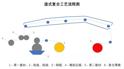 ????????濕式復(fù)合是在復(fù)合基材(塑料薄膜、鋁箔)表面涂布一層膠粘劑,在膠粘劑未干的狀況下,通過壓輥與其他材料(紙、玻璃紙)復(fù)合,再經(jīng)過熱烘道干燥成為復(fù)合薄膜。濕式復(fù)合的特點(diǎn)是工藝操作簡單,膠粘劑用量少,成本低,復(fù)合速度快。濕式復(fù)合法采用的膠粘劑主要有聚乙烯醇、硅酸鈉、淀粉、聚乙酸乙烯、乙烯-醋酸乙烯共聚物、聚丙烯酸酯、天然樹脂等。濕式復(fù)合機(jī)工作原理與干式復(fù)合基本相似,所不同的是干式復(fù)合是將涂布膠粘劑的薄膜經(jīng)過烘道加熱,待膠粘劑中有機(jī)溶劑揮發(fā)后,再與復(fù)合材料熱壓粘合;而濕式復(fù)合法是將涂布膠粘劑的薄膜直接與復(fù)合材料復(fù)合后,再進(jìn)入烘道進(jìn)行干燥。