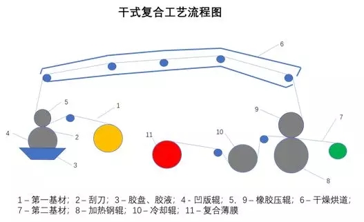 ????????在復(fù)合膜的各種加工技術(shù)中,干式復(fù)合是我國最傳統(tǒng)、應(yīng)用最廣泛的一種復(fù)合技術(shù),廣泛應(yīng)用于對食品、藥品、化妝品、日用品、輕工產(chǎn)品、化學(xué)品、電子產(chǎn)品等的包裝。干式復(fù)合是用涂布裝置(一般采用凹版網(wǎng)線輥涂布)在塑料薄膜上涂布一層溶劑型膠粘劑,經(jīng)復(fù)膜機(jī)除去溶劑而干燥,在熱壓狀態(tài)下與其他基材復(fù)合,如薄膜、鋁箔等粘合成復(fù)合膜,工藝流程如下圖所示,由于它是在膠粘劑“干”的狀態(tài)(無溶劑狀態(tài))下復(fù)合的,因此叫干式復(fù)合。