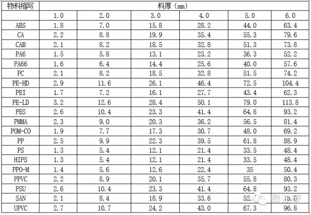 ????????上述計算數(shù)值是物料冷卻至模溫所需時間,但在很多實例里這是物料冷卻至耐變形溫度的時間。而這時間是決定注塑件是可以在不變形狀態(tài)下頂出的。所以以上數(shù)值是可以理解為最大值。