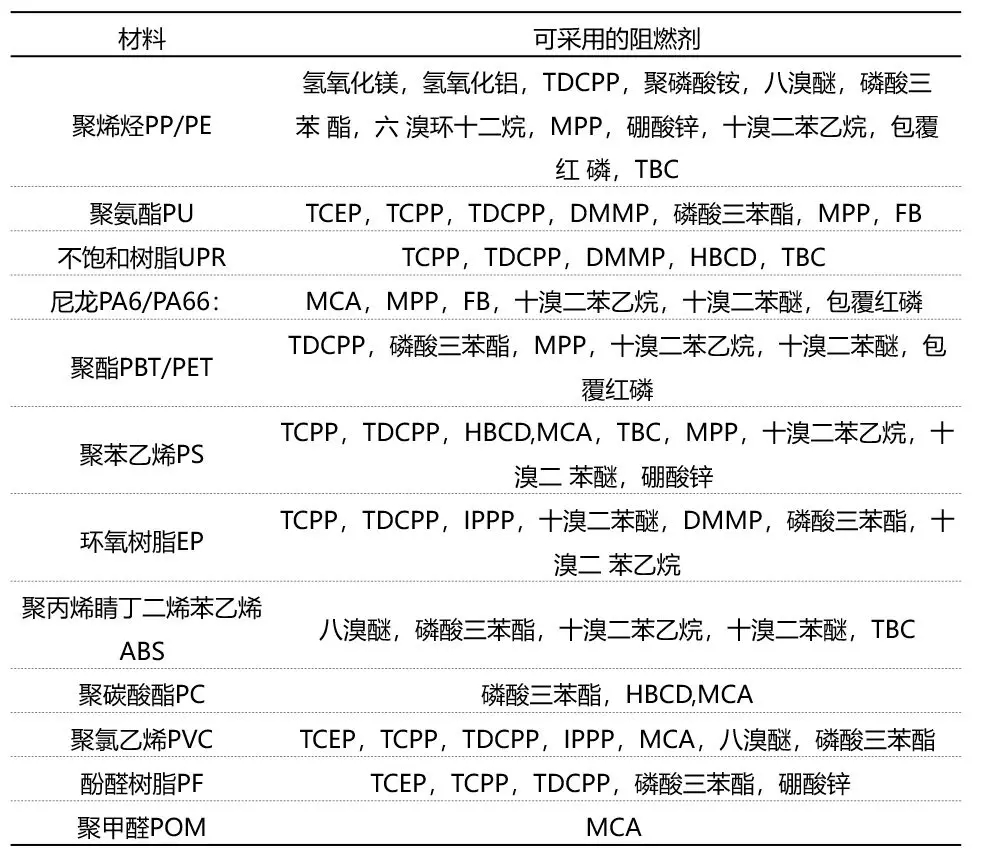 ????????下表是比較常見改性材料常用阻燃劑。當(dāng)然,除了表格中列出的,許多新的磷氮系阻燃劑都已經(jīng)被開發(fā)出來或正在開發(fā)中。雖然很多新產(chǎn)品有著各種各樣的問題,但是隨著研究人員的研究不斷深入,我們相信這些新產(chǎn)品會很快應(yīng)用于工業(yè)生產(chǎn)中。