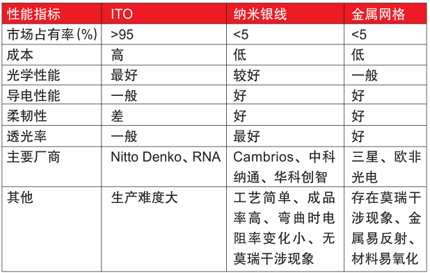 ????????納米銀線是一種直徑在納米范圍(一般在20-100納米之間)、長度沒有限制的金屬銀一維纖維。納米銀線具有體積小、比表面積大、良好化學(xué)性能和催性能、導(dǎo)電性能、抗菌性能和生理相容性,具體如表4所示。納米銀線的生產(chǎn)方法有:模板輔助、多元醇、光波輻射、軟化學(xué)溶劑熱等,多元醇法由于操作簡單、生產(chǎn)效率高、成本低廉成為當(dāng)前主流生產(chǎn)方法,缺點是產(chǎn)品濃度低。例如納米銀線可以生產(chǎn)透明柔軟塑料導(dǎo)電膜,具體結(jié)構(gòu)為基材為PET薄膜,涂覆層為納米銀線分散液,表層為丙烯酸保護涂層?;臑橹螌?,中間涂層為透明導(dǎo)電層,保護層為保護銀不被氧化降低導(dǎo)電性能,主要替代ITO和金屬網(wǎng)透明導(dǎo)電薄膜。