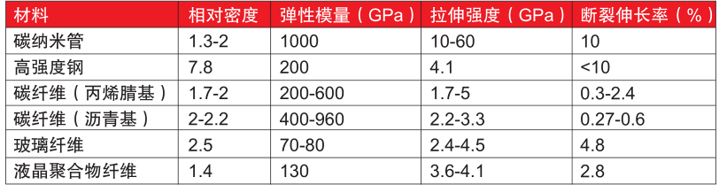 ????????碳納米管是一種理想的一維模型材料,巨大的長徑比使其具有類似碳纖維的性能,即高強度、高模量。其重量為鋼的1/6,強度為鋼的100倍,比強度為鋼的600倍,具體見表2所示。
