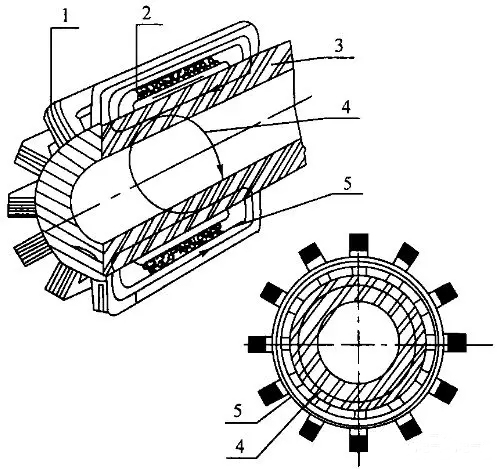 ????????這種加熱器是在機(jī)筒的外壁上隔一定的間距裝上若干組外面包以主線圈5的硅鋼片1。當(dāng)將交流電源通入主線圈時(shí),就產(chǎn)生了如圖中所示方向的磁力線,并且在硅鋼片和機(jī)筒之間形成了一個(gè)封閉的磁環(huán)。當(dāng)磁通發(fā)生變化時(shí),就會(huì)在封閉回路中產(chǎn)生感應(yīng)電動(dòng)勢(shì),從而引起二次感應(yīng)電壓及感應(yīng)電流,即圖中所示的環(huán)形電流,亦叫電的渦流。渦流在機(jī)筒中遇到阻力就產(chǎn)生熱量。